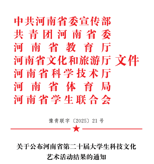 近日,中共河南省委宣传部、共青团河南省委、河南省教育厅、河南省文化和旅游厅、河南省科学技术厅、河南省体育局、河南省学生联合会等部门联合发布了《关于公布河南省第二十届大学生科技文化艺术活动结果的通知》文件,我校学子凭借扎实的专业素养、出色的创作能力与精彩的现场表现,在众多参赛高校中脱颖而出,共斩获16项省级奖项,再次彰显了我校在人才培养与素质教育领域的卓越成果。