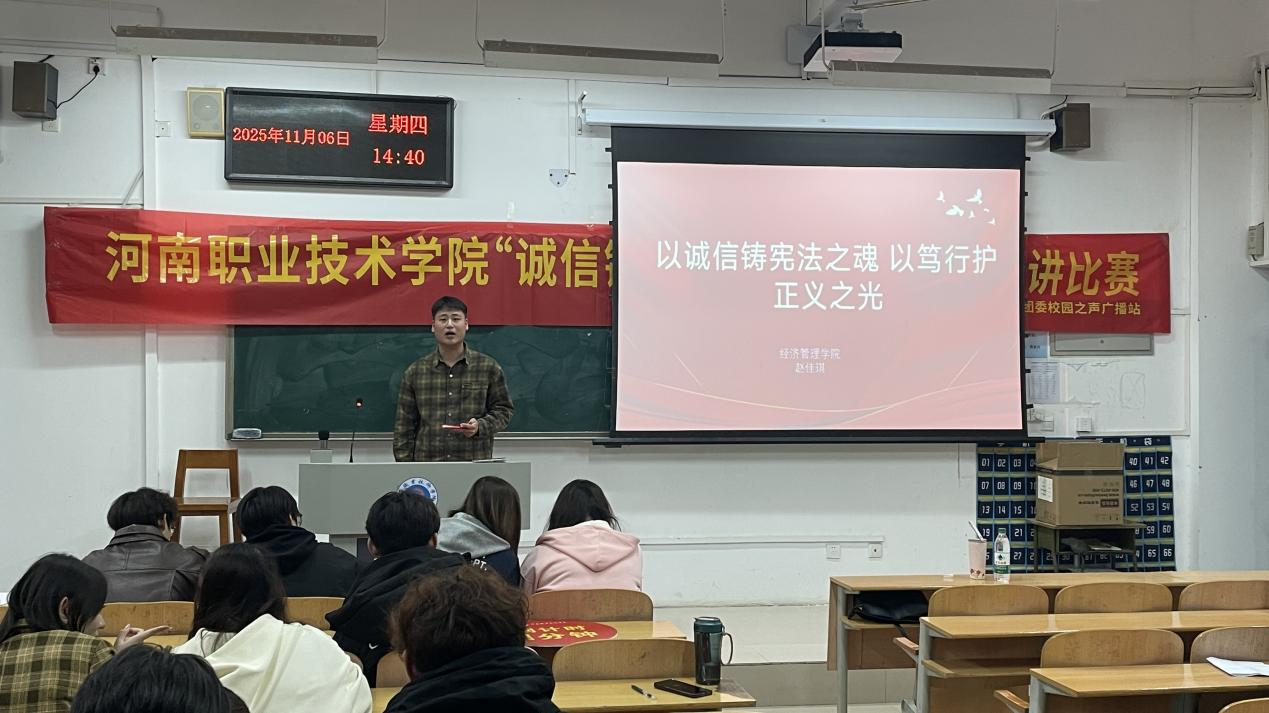 为厚植诚信文化、涵养法治精神,引导青年学子将诚信与法治内化为精神追求、外化为自觉行动,11月6日下午,由校园之声广播站主办的“诚信铸魂·法润校园”主题演讲比赛在1202教室顺利举行。