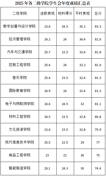 为全面总结2025年度各二级学院学生会工作成效,客观评价学生会组织履职情况,校团委完成了各二级学院学生会2025年度工作考核。现将考核成绩予以公示,接受全校师生监督。